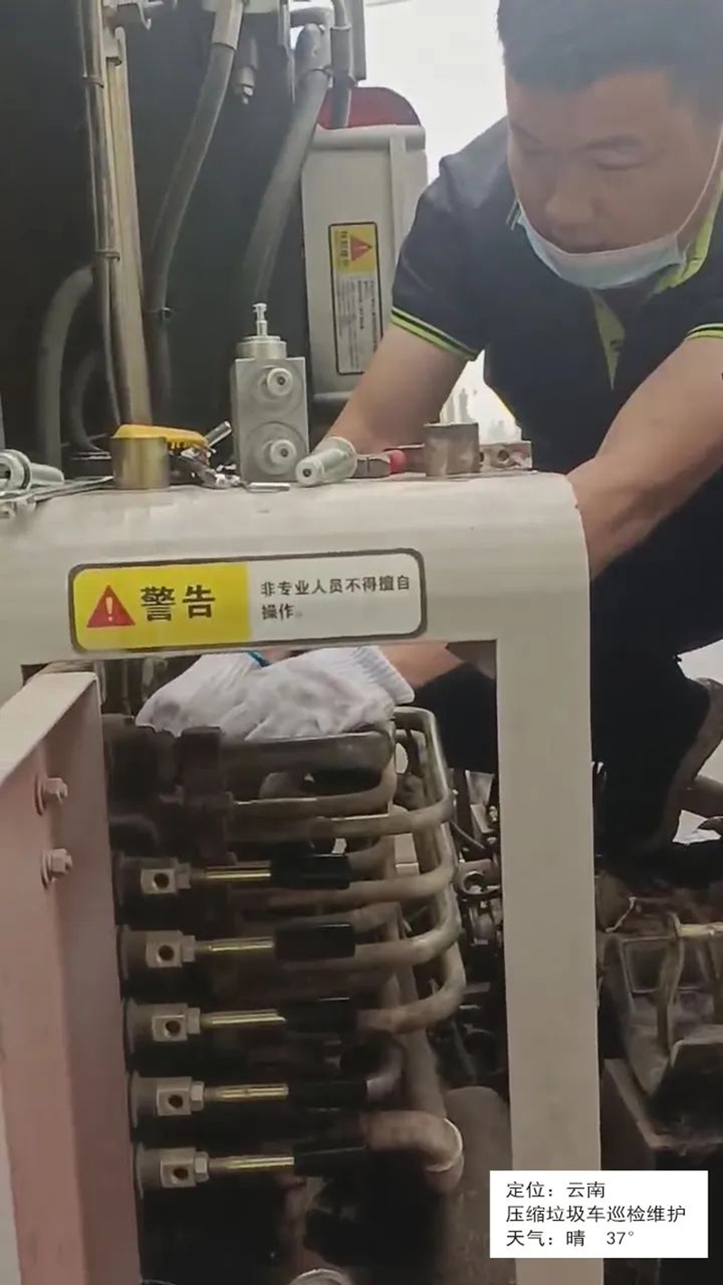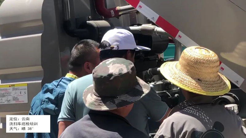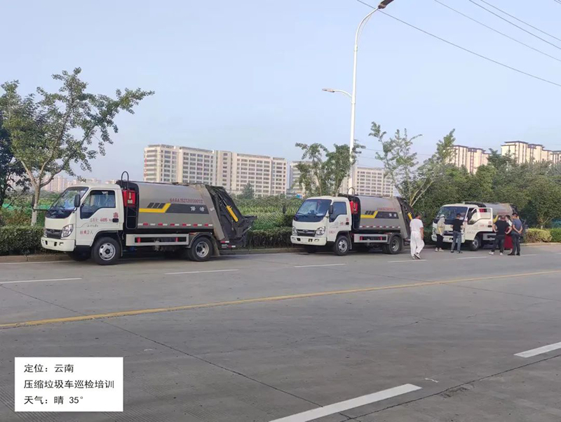 云南,售后人员进行车辆巡检,对于客户压缩垃圾车辆进行现场产品培训和讲解日常保养。