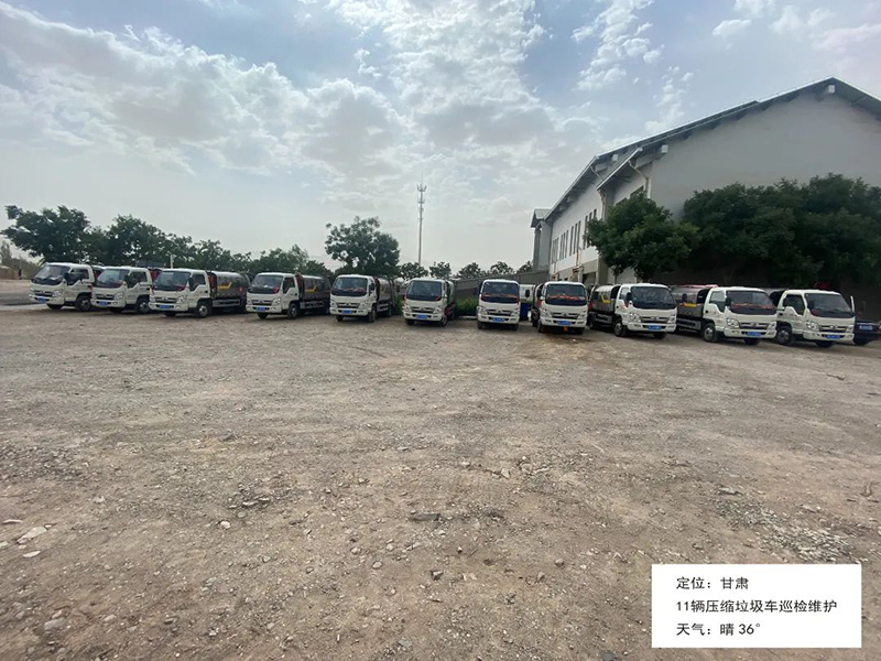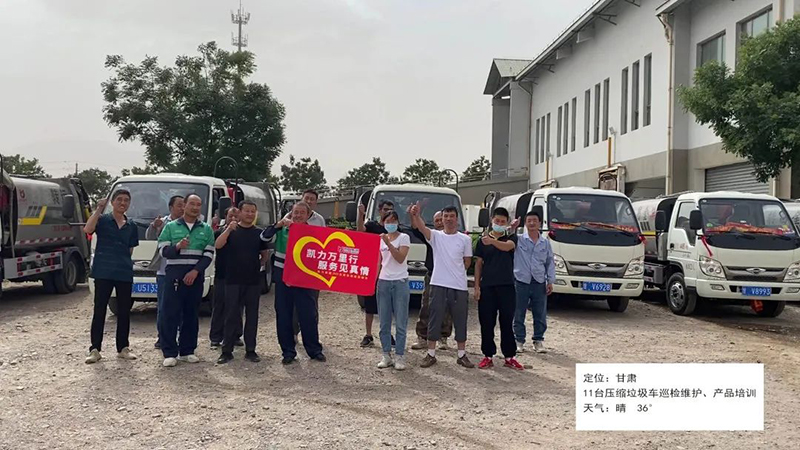 甘肃,36度高温天气,地表温度达到45度以上,售后团队顶着烈日,对十余台压缩垃圾车进行车辆巡检、维护、操作培训以及答疑解惑。