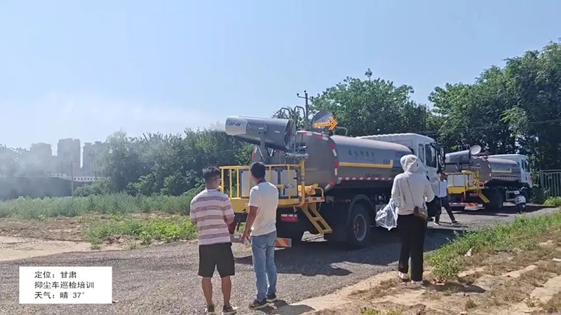甘肃,售后人员对两台抑尘车进行巡检和操作培训,当日高温37度。